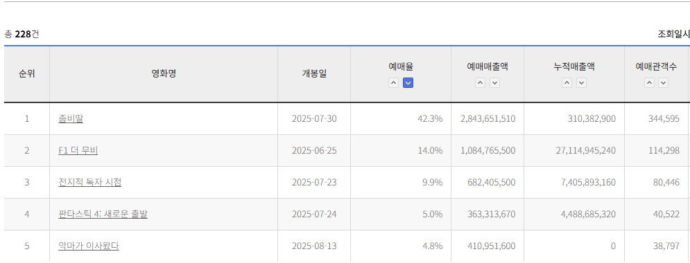 2025년 7월 29일 오후 4시 45분 기준, 영화 ‘좀비딸’사전 예매량 30만 32장을 기록했습니다. 이는 2024년 천만 흥행작 ‘파묘’의 28만 132장을 넘어선 수치로, 여름 시장 최강 흥행 후보로 급부상하고 있습니다.